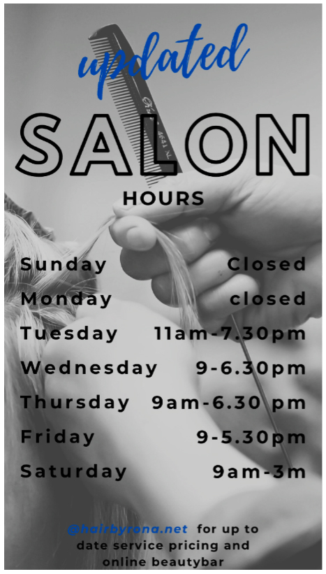 My hours are listed below, and like most stylists, I work by appointment only. When appointments are canceled with less than 24 hours’ notice, it’s tough to refill that spot—and that time is often lost.